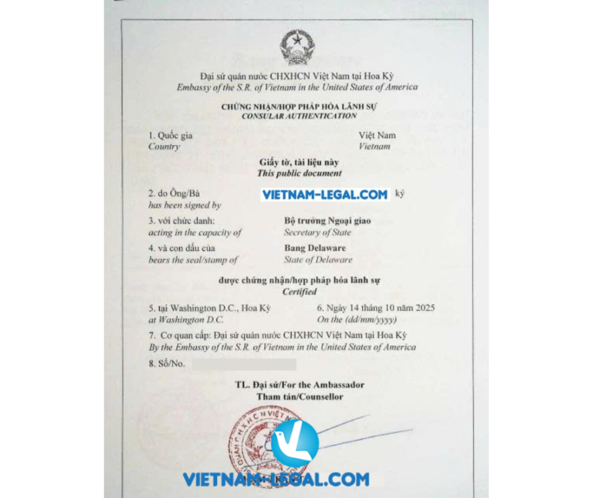 The result of China documents being consular certified and legalized for use in Vietnam is the official stamp and seal of the Vietnamese Embassy in China.